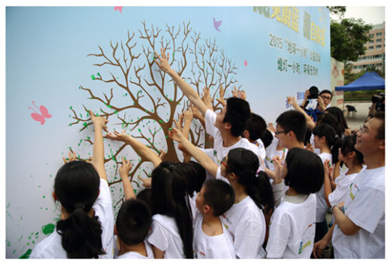 当天下午4时,在江门金汇益华文化广场上汇聚了500多名热心环保的大小朋友,还有一群五邑大学环境保护协会的志愿者。到场所有热心环保人士用绿色颜料在一块印有“树丫”的板上摁下手印,承诺加入“熄灯一小时”。28名环保天使一同站在“承诺书”前共同承诺。能源蔚蓝,源自你我???2015“地球一小时”活动正式拉开帷幕。